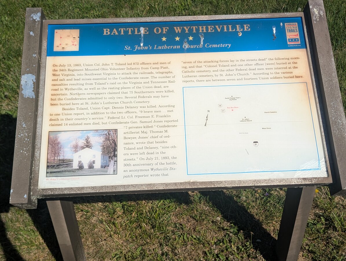Civil War Trails interpretive panel titled BATTLE OF WYTHEVILLE describing the July 18, 1863 Union raid led by Col. John T. Toland and the Federal dead buried at St. John's Lutheran Cemetery